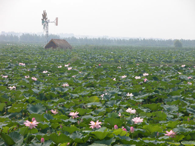 | 荷园位于水泗乡新区的西侧,总面积近两万亩,其中荷藕种植面积1.5万亩。园区内河渠纵横,水网密布。荷藕品种以本地“美人红”、“大紫红”、“雁来争”、“水选1号”、“野莲”为主,近年又引进了“武植2号”、“鄂莲”、“洪湖莲”、“太湖莲”、“太空莲”等,是江苏省莲藕新品种引进和良种培育基地。园区的东湖和西湖盛产鱼、虾、蟹、龟、鳖等水产品,遍长芦苇、蒲草,形成了较为独特的生态旅游景观,有“苏中沙家浜”之美称。 水泗乡地处宝应县东荡,位于扬州、盐城、淮安三市交界处,素有“水乡泽国”之称。荷藕种植面积达8.5万亩,总产量达10万吨,建有省级荷藕脱毒苗培育技术示范园和省级无公害荷藕生产基地。1998年,以水泗乡为主要荷藕生产基地的宝应县被国家农业部等六部委命名为“中国荷藕之乡”。水泗荷藕,自唐代至今已有1200多年历史,明朝洪武年间已有种植荷藕的史书记载。每逢中秋佳节,民间有选用—上等连枝藕供奉月亮和吃藕饼的习俗。清朝雍正年间,水泗藕粉被选为皇室贡品,誉为“鹅毛雪片”。 关于水泗荷藕,这里有一个美丽的传说:相传在很久以前,宝应的五湖四荡原来是白水一片,只长些芦苇、蒲草。有一回,天宫的玉皇大帝和王母娘娘散步来到瑶池。他们拨开云层,遥望人间,只见安宜东荡地区一泓碧波,百里方圆,水天一色,好一派湖荡风光。玉皇大帝见状,连声赞道:“妙哉!妙哉!此乃人间仙境啊。”王母娘娘在一旁附和道:“此景虽妙,但有不足,缺少花卉点缀。”玉皇大帝点头称是,便命荷花仙子捧出一把瑶池莲子,撒向水泗湖荡。从此,这里便是莲叶田田,荷花盛开,粉白嫣红,一片清香,宛如天上的瑶池仙境。 行进在前往水泗荷园的路上,一幅幅生动的画面不时地映人游人的眼帘:公路两旁的稻田里挂满了金灿灿的稻穗,圩堤边爬着又大又肥的螃蟹,湖荡里藕农们在墨绿色的荷叶下不停地淘藕。 当游人踏进荷园,首先映人眼帘的是由江苏省书法家协会会员赵文澜先生书写在界碑上的遒劲有力的两个大字——“荷园”。 “接天莲叶无穷碧,映日荷花别样红”。走在荷园桥上,便会使游人真正感受到自己已经与“中国荷藕之乡——宝应”亲密接触了。站在荷园岸边,放眼望去,眼前呈现出一片浩瀚的荷花荡。在耀眼的阳光下,万亩荷花荡的尽头则是碧绿—片。座落在荷花荡里的四座风车,风叶迎风转动,有着—一种执着不阿的精神,远远望去,好似四只巨大的河鸟在空中翱翔。田埂小路旁的芦苇、蒲草、睡莲等自然景观更是尽收眼底,妙不可言。 乘船行进在荷花荡中,则是另一种心境。船夫竹篙轻点河水,小船便如离弦的箭一样向前飞去。接过藕农们递来的鲜藕,洗去泥污,再送进嘴里,那脆嫩鲜活的感觉,即刻会使你忘却一切烦恼。在荷花荡里观光,最叫人开眼界的莫过于藕农们淘藕的场景了。藕农们淘藕,有三五一群的,也有十多个人在一起的。他们淘藕时就像魔术师变魔术一样,齐腰淌在水里,从水里取出——枝枝鲜亮的藕枝出来,直看得人眼花缭乱。 根据史料记载,荷藕具有许多的药用价值,清香可口,健胃消食,利便防痔,降脂降压,以及调节人体代谢等功效。为了进一步开发和扩大荷藕利用价值,水泗乡已建有全国规模较大的荷藕批发交易市场,创办了四个荷藕加工企业,生产盐渍藕、保鲜藕、水煮藕、捶藕、精制藕粉、藕粉圆、碧荷茶等,大部分产品远销日本、韩国,以及东南亚等国家和地区,受到国内外消费者的欢迎。荷园开放以来,吸引了众多中外游客前往光。2002年荷花盛开时节,中央电视台、上海东方电视台、江苏电视台、法国公共电视台等新闻媒体纷纷到荷园取景,拍摄专题片,并在法国、美国、加拿大等欧美国家播放,产生了国际影响。 如今,荷园已被江苏省立项,作为自然生态项目加快建设。这里还将增加多处观光景点,如建曲桥、荷亭,没垂钓中心、藕产品展示馆,让游客看得舒心,尝得开心,玩得尽兴。 |