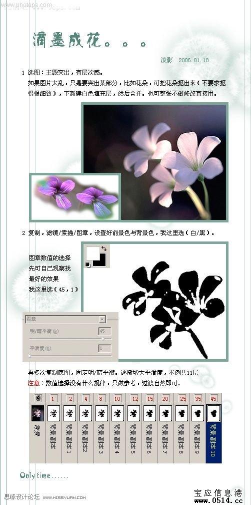 选图:主题突出,有层次感,假如图片太乱,只是要突出某部分,比如花朵,可把花朵抠出来,不要求抠得很细致,下新建白色填充层,然后合并,也可不做修改直接用.
