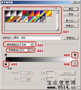 A01:为渐变映射的预设,用鼠标点击渐变方块,就可应用该渐变映射,还可通过预设右上面的小三角与载入、存储按钮来读取与保存自定义的预设