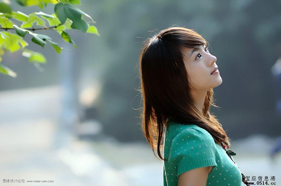 照片拍得很美,无论是用光还是模特的表现都非常好。我们需要做的修改工作是调节照片的构图,让模特与风景联系更加紧密。模特的视线是十分重要的元素,假如我们将她改为面向左方,就可与树叶相呼应,照片会更有意境。